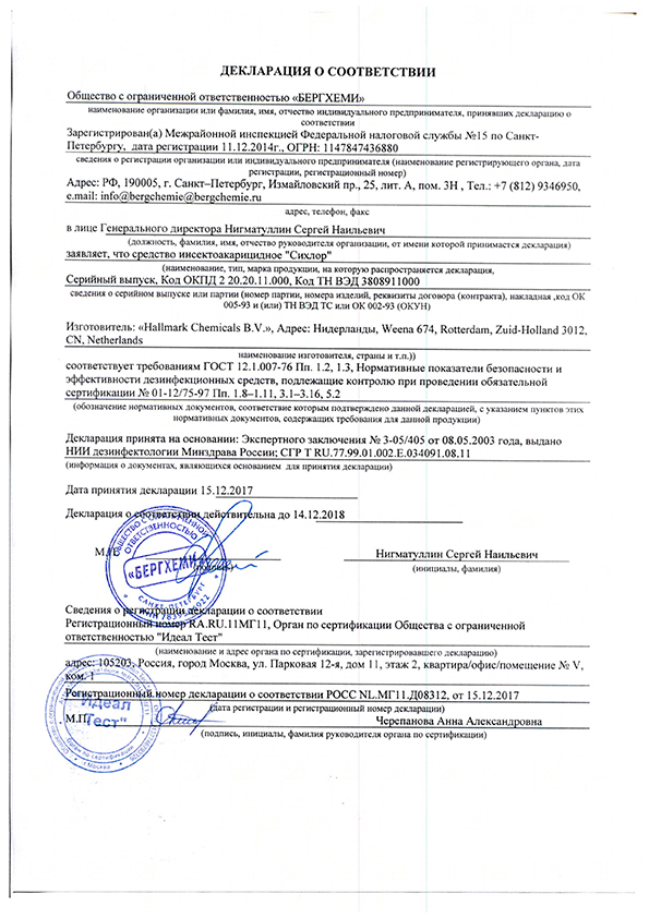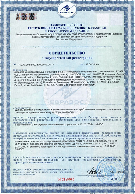 Прежде чем начать обработку, мастер по вашей просьбе предоставит сертификат соответствия на используемое им средство, в котором прописано на каких насекомых оно действует и в каких помещениях или территориях им разрешено проводить обработку.